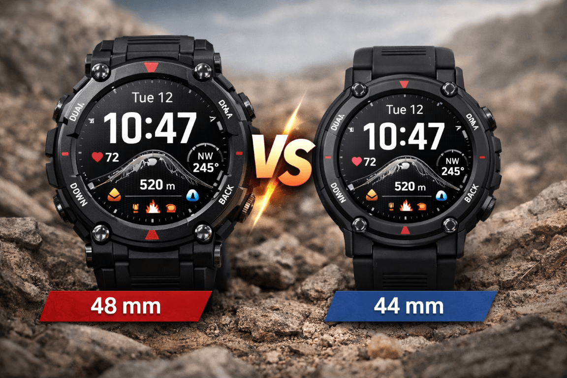 Jeśli zastanawiasz się czy wybrać Amazfit T-Rex 3 Pro 44 mm vs 48 mm, wszystko sprowadza się do preferowanego rozmiaru zegarka.