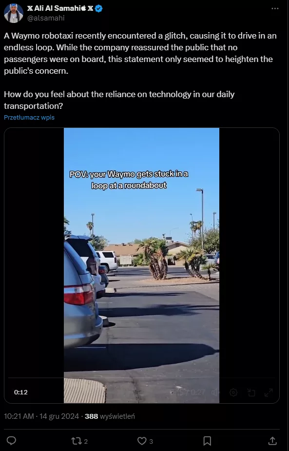 Rozwój autonomicznego transportu postępuje, jednak wciąż występują w nim błędy. Niedawny incydent z udziałem autonomicznej taksówki Waymo unaocznia, że choć technologia jest obiecująca, nie osiągnęła jeszcze pełnej niezawodności. W jednym z miast w USA pojazd utknął na małym rondzie, krążąc wokół aż 37 razy, zanim operatorzy zdołali naprawić problem.