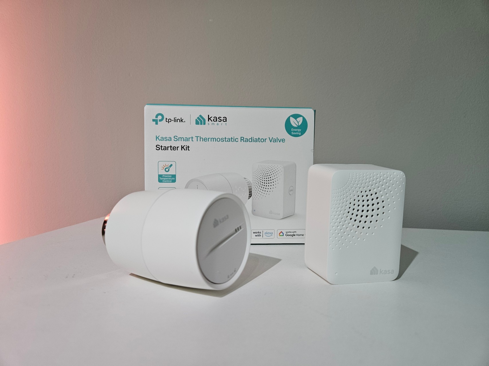 Termostat działa w standardzie Matter, dlatego do jego obsługi niezbędna jest dedykowana bramka. Tę funkcję pełni KH100 – dostępna w zestawie lub do nabycia osobno. Urządzenie wystarczy podłączyć do gniazdka, połączyć z domową siecią Wi-Fi za pomocą aplikacji Kasa, a następnie dodać termostat lub inne urządzenia obsługujące standard Matter.